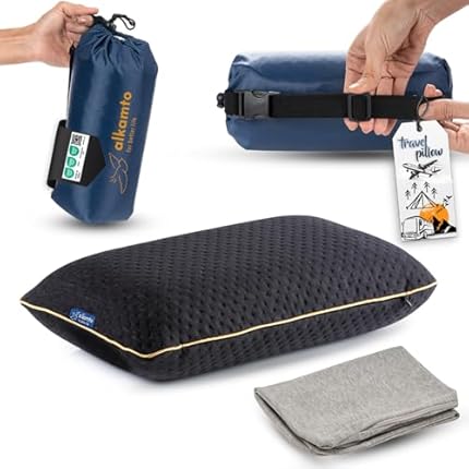 alkamto Travel & Camping Comfortable Memory Foam Pillow – Easy to Carry Portable Bag – Temperature Regulating Pillow Case (Black + Extra Cover)