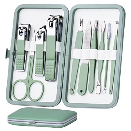 Manicure Set 10 in 1 Stainless Steel, Nail Clippers Scissors Pedicure Tools Kit – Portable Travel Grooming Kit for Men and Women with Leather Case (Jade Green)