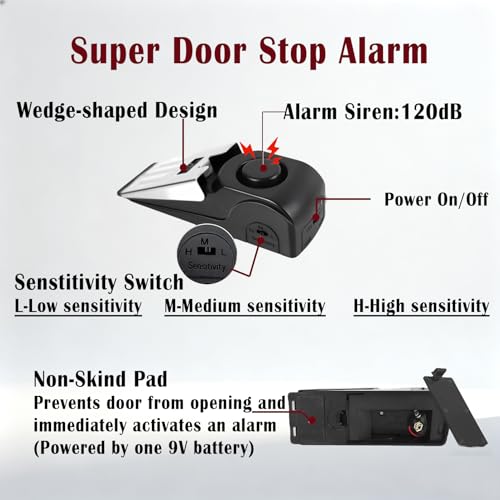 ALARM FEATURE: Built-in 120dB siren activates automatically when door pressure is applied, deterring potential intruders(Note: If the door stop alarm sound cannot be turned off, please adjust the sensitivity to M or L, and then turn it on again)