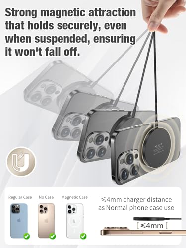 【Sleek, Portable & Case-Friendly Design】 Crafted for life on the go. Measuring just 55mm in diameter and weighing about 47g, this ultra-slim and lightweight charger is incredibly portable. Its minimalist design slips effortlessly into your bag for shuttle. The strong magnetic connection works through most cases under 4mm thick—no wish to remove your favorite protective case every time you charge. Premium materials offer a protected grip and a sleek, scratch-resistant surface.