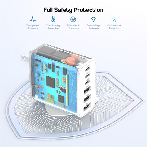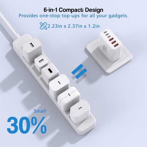 6-Port Power Adapter:With 3 USB-C and 3 USB-A ports,this charger can concurrently power up to 6 devices,allowing you to charge your phone,tablet,and headphones at the same time minimizing wait times.Additionally it is a great space-saver,getting rid of the need for a couple of wall outlets.