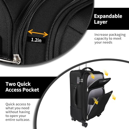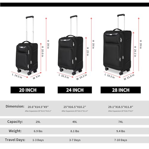 Top Softside 3-Piece Luggage Set: Set contains a carry-on 20″ luggage, a 24″ checked suitcase, and a 28″ large luggage. Each suitcase is equipped with a 1.2-inch expansion feature and two front open pockets, allowing for quick access to items and providing additional storage space as needed.