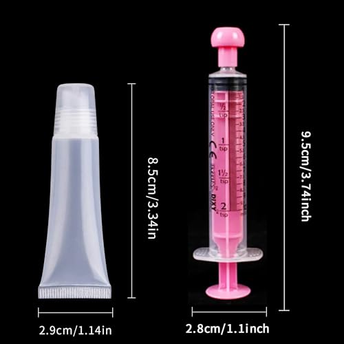 With a capacity of approximately 8ml, these lip gloss containers have dimensions of approximately 8.5cm/3.3 inches in length and 3cm/1.2 inches in width. They are lightweight and practical, and they come with a 5ml syringe for liquid filling
