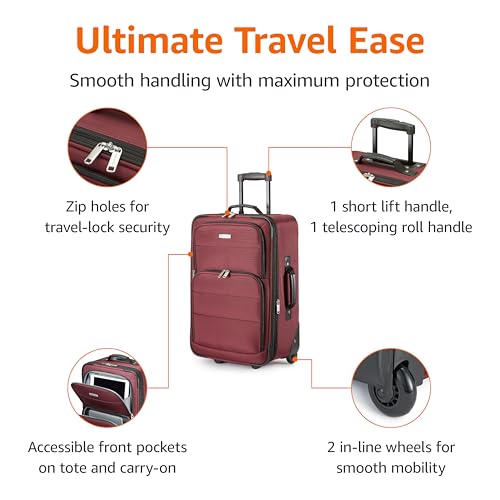 Amazon Basics Luggage Sets, Carry-On 23-Inch, tote 15-Inch, Suitcase With Wheels, Expandable Extra Space (+15%), Front Pockets and Telescopic Handle, Burgundy