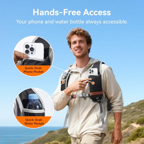 Quick-Grab Convenience, Total Freedom: The CROSSGEAR hiking backpack features quick-access shoulder strap pockets, keeping your phone and water bottle within easy reach. Fits 1.06″ diameter bottle and 6.8″ phone—stay hydrated and capture moments on the go without stopping.