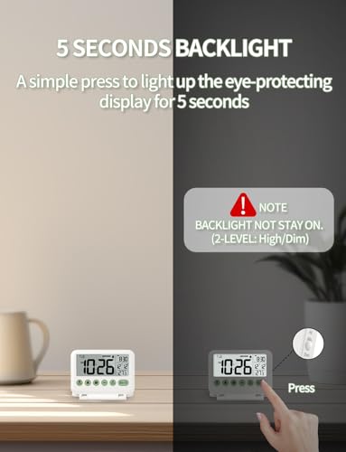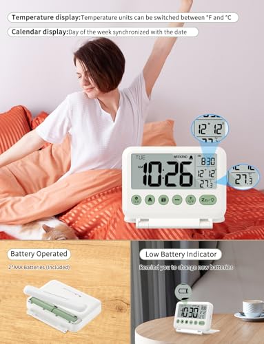 Digital Travel Alarm Clock – 3.54 inch LCD Display, 9-Minute Snooze, 2 Volume Levels, Backlight, Battery Included (White)
