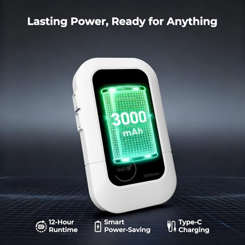 【Portable & Long-Lasting】 Weighing only 4.4 oz, this compact mobile hotspot fits perfectly in your pocket. 3000 mAh battery delivers up to 12 hours of continuous use. Coupled with a smart power-saving mode (device robotically enters sleep when idle and wakes with a button press), it ensures you stay reliably connected on road trips without worry