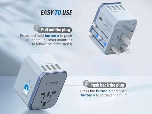 The EPICKA TA-105 universal commute adapter comes with 4 plug types that may be used in 200+ countries and regions, including the United States, Europe, the United Kingdom, Australia, and more. It has 2 USB-A ports (2.4A) and 3 USB-C ports (up to 3A), making it suitable for laptops, phones, tablets, and other USB-charged devices. Features built-in 10A fuses, safety shutters, a plug lock button, and FCC, CE, and RoHS certification.
