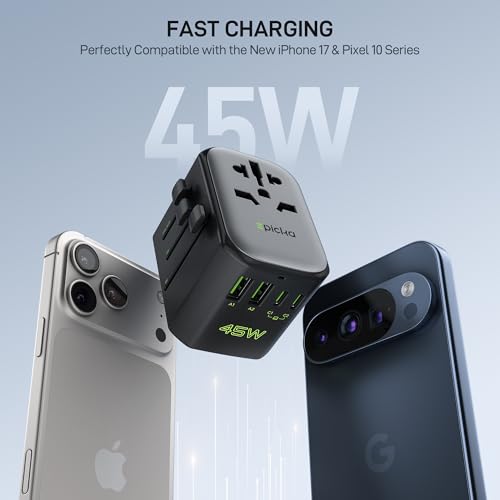 EPICKA Pulse 45W European Travel Plug Adapter, Universal Power Adapter with PD Fast Charging, 5-Port (1 AC/2 USB-A/2 USB-C) International Charger Adapter for Europe, Japan – Travel Essentials (Black)