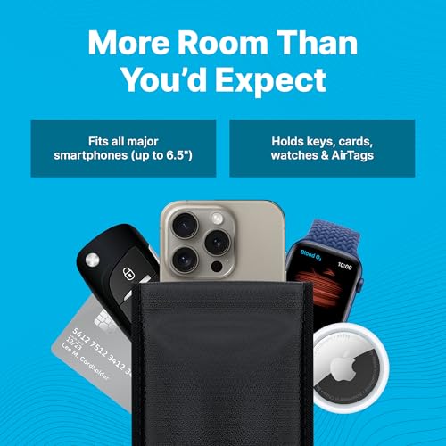 SPACIOUS STORAGE – With room for phones, credit cards, keys, watches, and/or AirTags. Lightweight and sleek black design is ideal for students in school, workplaces, trip, and protecting sensitive information out in public. Also serves as a Faraday key fob protector