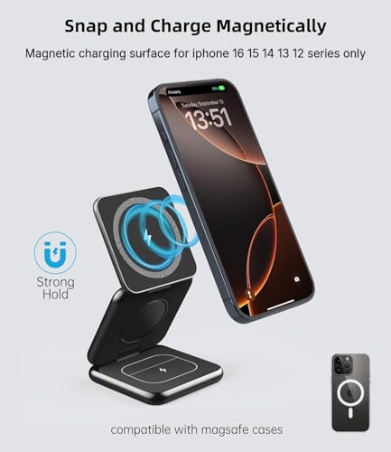 Strong Magnetic Wireless Charging: Built-in high-quality magnets to hold iPhone precisely in the best charging position and lock automatically. Built-in 3 coils wide charging area to bring you a fast and stable wireless charging experience. Put your iPhone onto the device horizontally or vertically to get it charged instantly. Compatible with iPhone 16/15/14/13/12 series (Please work without cases, or use magnetic cases)