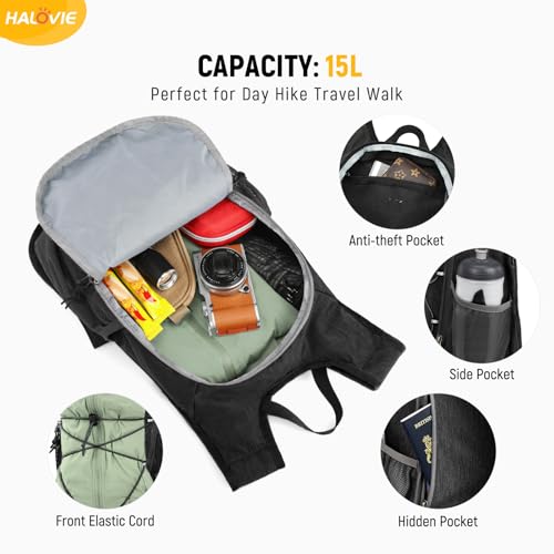 HALOVIE 15L Foldable Hiking Backpack Phone Pocket Lightweight Travel Daypack Shoulder with Chest Strap Small Packable Pack for Walking Women Men (Black)