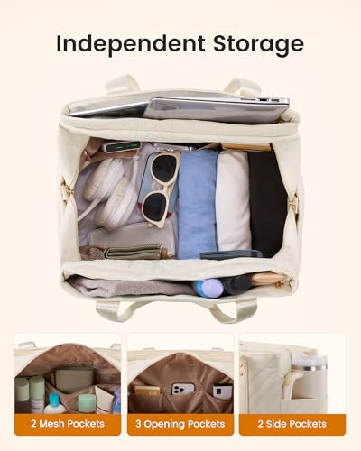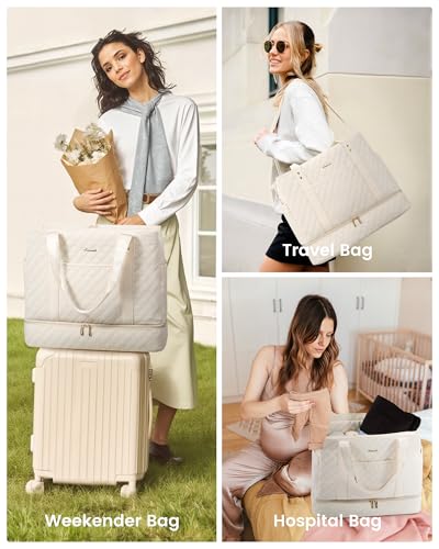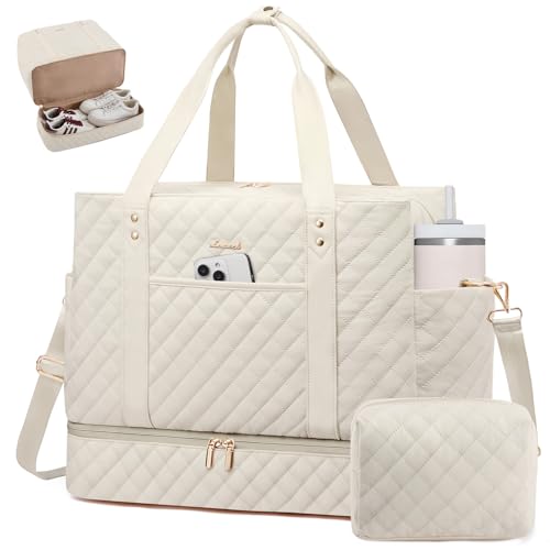 LOVEVOOK Large Travel Duffle Bag for Women, 45L Weekender Bags with Shoe Compartment & Wet Pocket, Quilted Carry On Personal Item Bag, Overnight Hospital Bags for Labor Delivery Beige