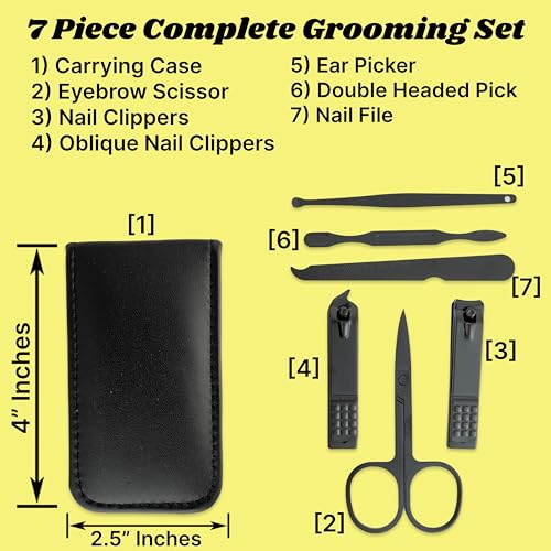 7-in-1 GROOMING ESSENTIALS with 6 TOOLS and STYLISH CASE: 1 nail clippers, 1 oblique nail clipper, 1 eyebrow scissor, 1 file, 1 double headed pick, 1 ear pick and 1 compact carrying case. Perfect for fingernails, toenails, and fine detailing.