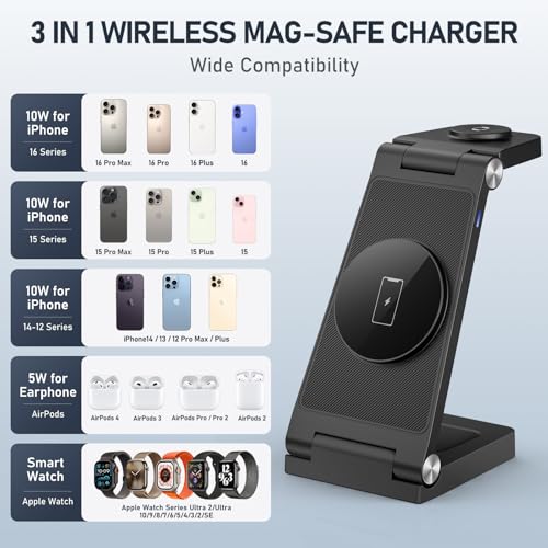 2025 Upgraded 3 in 1 Foldable Wireless Charger: The charging station for More than one devices, compatible with iPhone, iwatch, AirPods concurrently. It is suitable for all iPhone 12-17 series. Compact size, well built, fast charging, space-saving, exactly what you want. Gifts for people who Commute for work OR international travelers