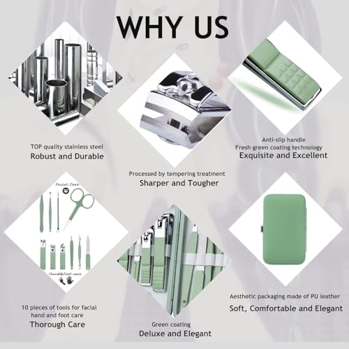 Manicure Set 10 in 1 Stainless Steel, Nail Clippers Scissors Pedicure Tools Kit – Portable Travel Grooming Kit for Men and Women with Leather Case (Jade Green)