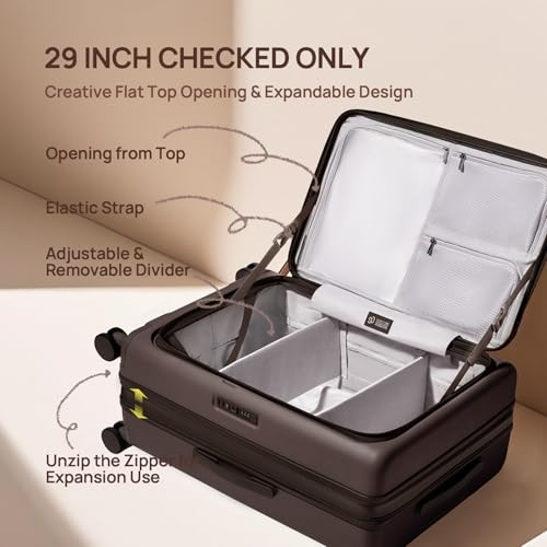 NINETYGO Large Checked Luggage 29 Inch, Flat Top Opening Check In Luggage with Brake Wheels, Expandable, Coffee-Infused PC Hard Shell, Eco-Friendly, TSA Lock, 360° Spinner Wheels (Latte)
