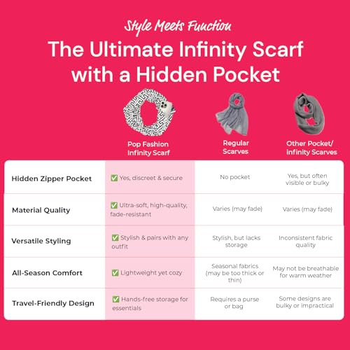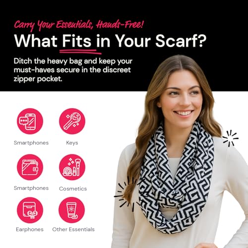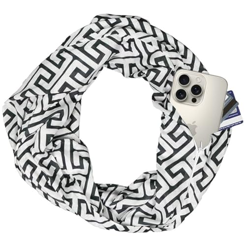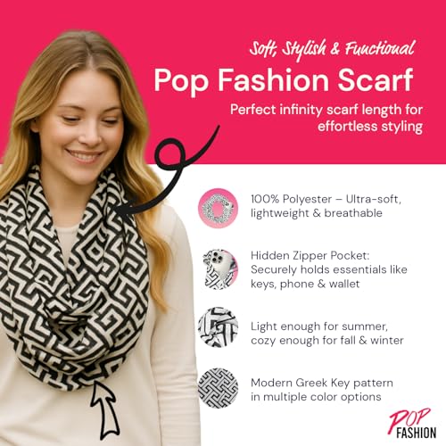 Pop Fashion Infinity Scarf for Women – Travel Scarf with Hidden Pocket – Greek Key Pattern Scarves