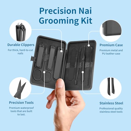 Precision 8 Pieces Men’s Nail Grooming Travel Kit, Stainless Steel Manicure Set with Fingernail & Toenail Clippers, Nail File, Slant Tip Tweezers, Cuticle Scissors, Cuticle Pusher, Travel Case
