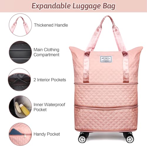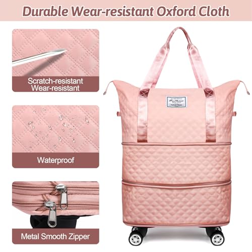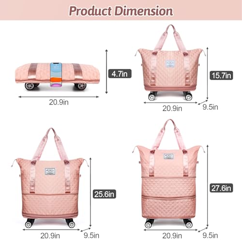 Rolling Duffle Bag with Wheels and Handle, Expandable Travel Duffel Bag Luggage Bag, Foldable Travel Bag with Wheels Rolling Carry on Bags, Large Wheeled Luggage, Pink