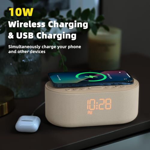 Multi-Functional Design: Experience the ultimate in convenience with our all-in-one white noise alarm clock. Built-in Bluetooth speaker and 10W fast wireless charger, Sleep timer,Dimmable,Snooze,12/24-hour format, DST, designed to streamline your morning routine and evening relaxation.