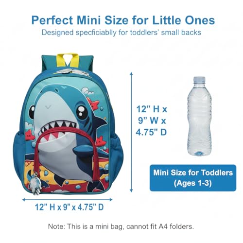 🦈 PERFECT TODDLER SIZE (12 INCH) – Specifically designed for little ones aged 2-4 years old. Measuring approx. 12″H x 10″W x 4″D, this mini backpack is perfectly sized for a juice box, snacks, a change of clothes, and a favorite toy. Note: This is a Mini size and CANNOT fit A4 folders