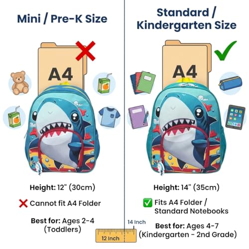 🦈 PERFECT TODDLER SIZE (12 INCH) – Specifically designed for little ones aged 2-4 years old. Measuring approx. 12″H x 10″W x 4″D, this mini backpack is perfectly sized for a juice box, snacks, a change of garments, and a favorite toy. Note: It is a Mini size and CANNOT fit A4 folders