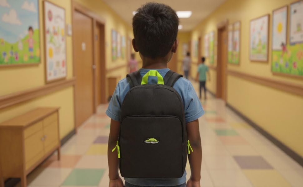 FEATURES: Roomy main compartment for school books and gym clothes, padded and adjustable straps, easy grip double zippers, & top hang handle