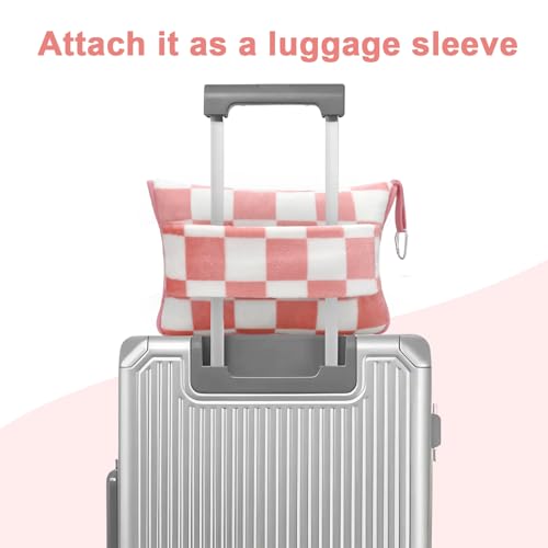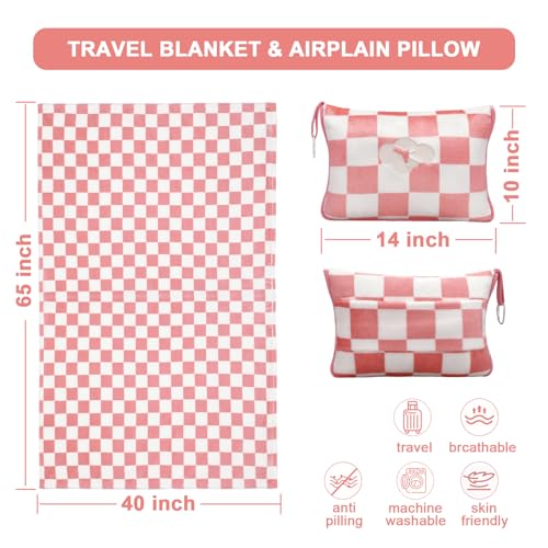 Travel Blanket and Pillow Compact, Premium Soft 2 in 1 Airplane Blanket with Soft Bag Pillowcase,Hand Luggage Sleeve and Backpack Clip (Ckeckered Pink)