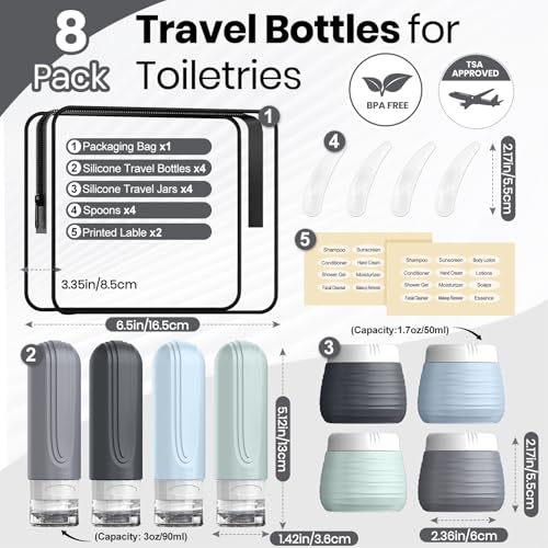 【8PCS TRAVEL TOILETRIES CONTAINERS】This 8 Pack Travel Bottles for Toiletries includes 4 silicone travel bottles(3OZ/90ML), 4 silicone travel jars(1.7OZ/50ML), 4 spoons, 2 printed label, and 1 clear zipper bag. It’s a one-size-fits-all solution for your travels