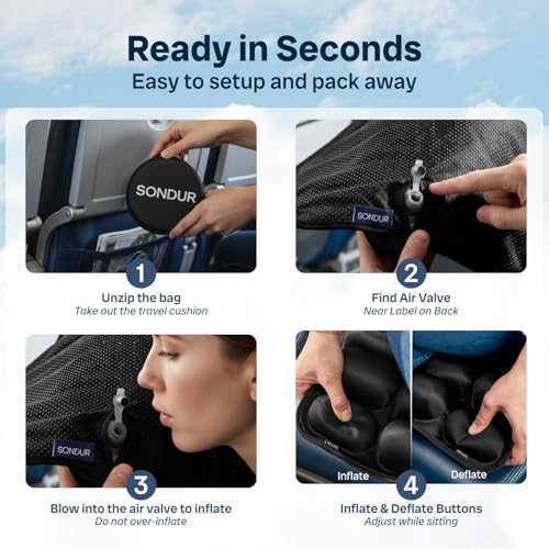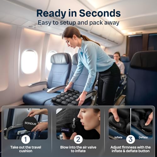 Easy Setup & Adjustable Comfort: This inflatable seat cushion for airplane inflates in just 3-4 breaths. Adjust firmness anytime with the built-in air pump and release valve—no want to stand up.