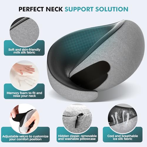 Travel Neck Pillows for Airplanes – 360° Ergonomic Memory Foam Travel Pillow – Relief Neck Pain with Breathable Support for Long Flights, Car, Train & Office Use – Adults & Kids (Gray)