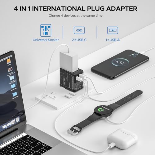4-in-1 International Power Adapter: Equipped with 3 USB ports (2 USB-C and 1 USB-A) and a universal AC socket, this adapter supports US, EU, UK, and AU plugs (excluding India and South Africa), allowing you to connect electronics from various countries. It can charge multiple devices simultaneously, making it ideal for iPhones, Samsung and other Android phones, smartwatches, tablets, power banks, cameras, handheld gaming consoles, earphones, and other USB-powered devices. Total USB output of 30W.