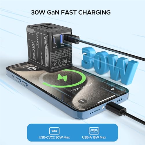 4-in-1 International Power Adapter: Equipped with 3 USB ports (2 USB-C and 1 USB-A) and a universal AC socket, this adapter supports US, EU, UK, and AU plugs (aside from India and South Africa), allowing you to connect electronics from more than a few countries. It can charge more than one devices concurrently, making it ideal for iPhones, Samsung and other Android phones, smartwatches, tablets, power banks, cameras, handheld gaming consoles, earphones, and other USB-powered devices. Total USB output of 30W.