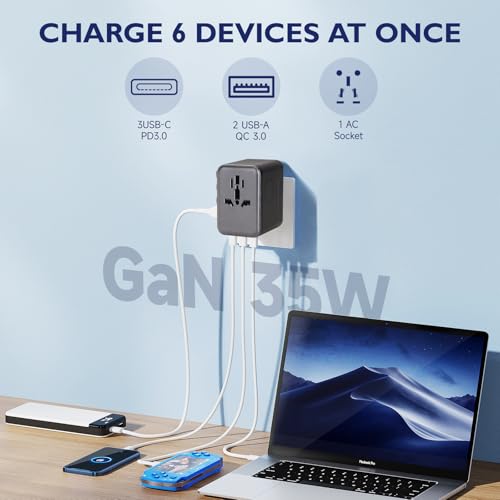 【35W PD FAST CHARGING & MULTI-DEVICE SUPPORT】 – Equipped with 2 USB-A ports, 3 USB-C ports, and a universal AC outlet, this trip adapter worldwide supports fast charging for smartphones, tablets, and other electronics. Whether you’re the usage of it as a universal charger adapter, a universal AC adapter, or an adapter plug converter, it delivers efficient power output for your whole devices