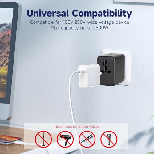 【6 IN 1 TRAVEL ADAPTER WORLDWIDE】 – In addition to 5 USB ports, there is also a universal AC outlet that converts plugs of US, EU, UK, AU, so you can plug electronics from different countries (except India and South Africa) into socket of this European travel plug adapter. Max capacity up to 2500 watt (max 250 Volt, 10 A)