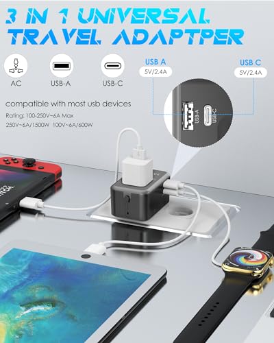 🌐 【Travel Adapter Built-in USB-A/USB-C Ports】– Our international power adapter has two USB ports. 1 x USB-A port, 1 x USB-C port, and 5V 2.4A per output, plus AC sockets. Allowing to charge up to 3 devices simultaneously. This international plug adapter can fully meet your basic usb charging needs.