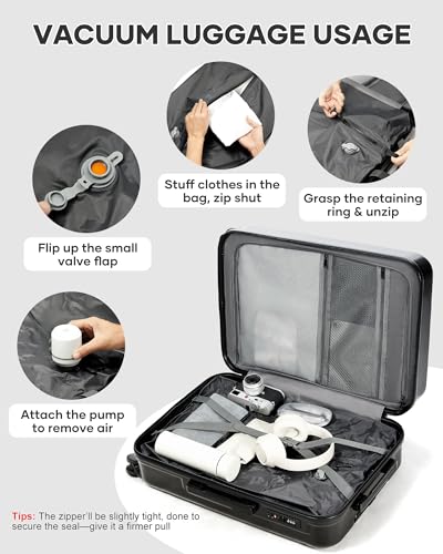 【Multi-Size Options & Vacuum Compression System】 This set includes 20″, 24″, and 28″ suitcases to accommodate short trips, business travels, and extended journeys. Every main compartment features a vacuum-sealed layer, accompanied by two pumps (plug-in & USB rechargeable) for for home and commute use. Quickly compress bulky items like down jackets—freeing up space for 3-5 extra outfits in comparison to standard luggage. Perfect for stress-free long trips.