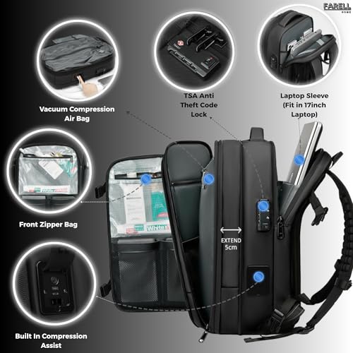 Vacuum Seal Travel Backpack, 60L Expandable Integrated Air Compression Button Water Resistant TSA Lock, Airback Cabin Suitcase, Vacpack Backpack Black.