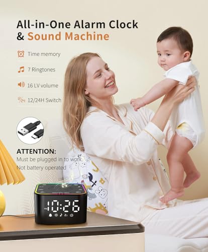 White Noise Sound Machine, Alarm Clock with Sound Machine for Sleeping, White Noise Machine with Digital Clock for Bedrooms, RGB Night Light, 30 Soothing Sounds for Baby Kids Adults