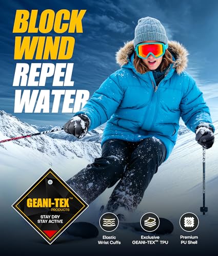 TRIPLE PROTECTION FOR EVERY SNOW JOURNEY! Featuring exclusive GEANI-TEX technology, these ski gloves repal rain and snow while wicking away moisture to keep your hands dry in freezing conditions. The upgraded PU shell with a waterproof coating lets water slide off instantly, while its high-density structure forms a strong wind-blocking barrier. Elastic wrist cuffs seal out cold air and snow for all-day warmth. Conquer every mountain with confidence under triple-layer weatherproof protection.