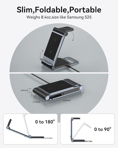 [Foldable Design & Travel Portable] This 3 IN 1 charger station for Samsung can be folded 180° into a wireless charging pad smoothly, small and not bulky and can be put in a bag or suitcase. This wireless charger stand is not only suitable for your home, office,and on a business trip, bring this 3in1 charger, which can charge multiple devices at once. Also, Versatile as a cell phone stand with angle adjustment.