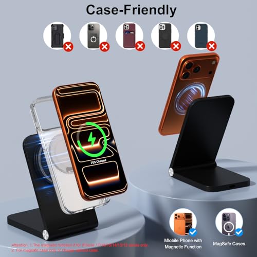 【Universal Compatibility】This iPhone charging station can charge all phones for iPhone 17, iPhone 16, iPhone 15, iPhone 14, iPhone 13, iPhone 12 series. Magnetic charger is also compatible with AirPods Pro 2, AirPods 3 (Not for AirPods 2 non-wireless version). WARM TIPS: All other phones that only strengthen wireless charging MUST be charged with a magnetic case for better results.