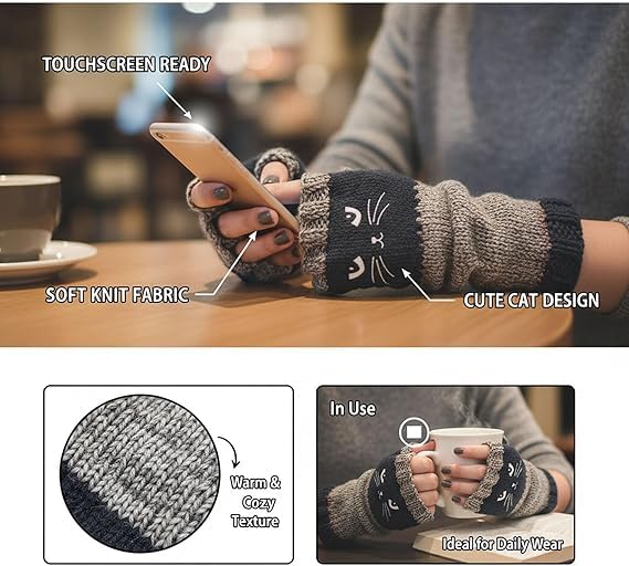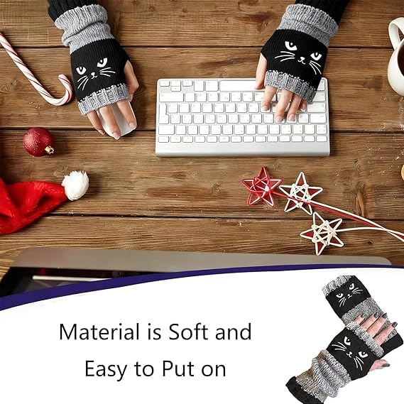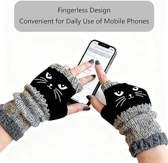 Women’s Knitted Fingerless Gloves with Cat Embroidery,Thick Warm Winter Gloves,Essential for winter travel