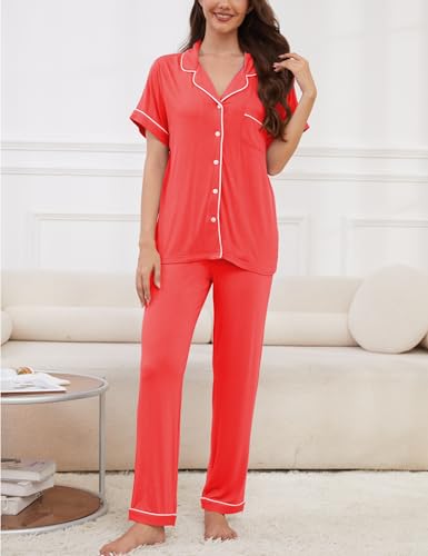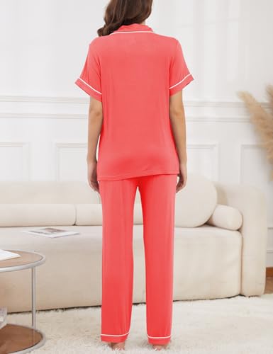 Ekouaer Pajama Sets for Women Short Sleeve Pj Set V Neck Sleepwear Chest Pocket with Long Pants Casual Loose Loungewear