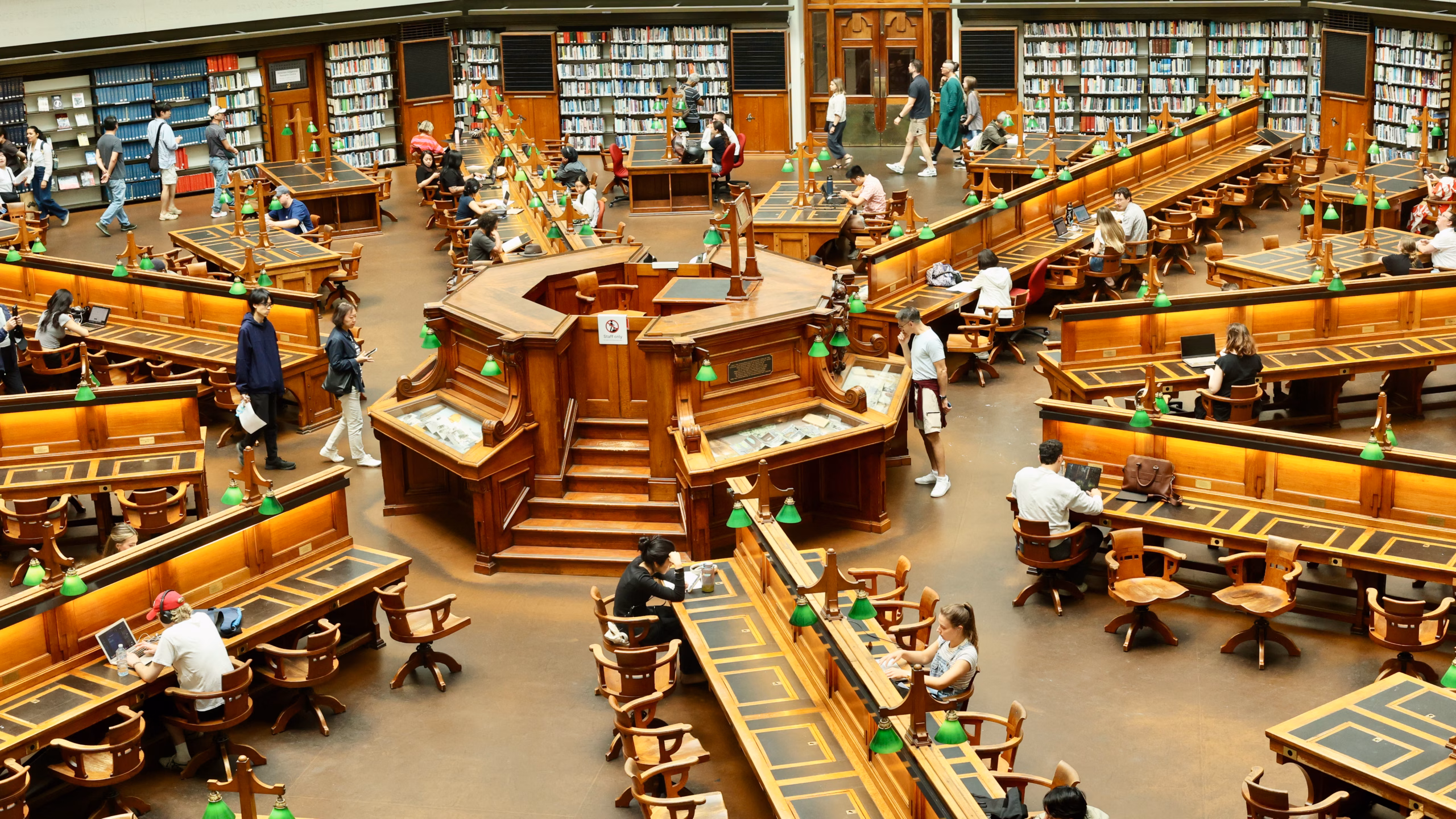 The reading desks radiate outward from a central octagonal platform – the raised desk where librarians once sat to oversee the room. Each desk has its original silky oak chair and a green glass lamp. The room can seat 320 readers and house 32,000 books. On the day I visited, most of those seats were occupied by students working quietly, completely undisturbed by the stream of visitors looking up in amazement around them.